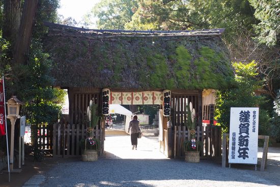 簡素で茅葺屋根の随神門が現れます。寛永4年(1627)築。苔むした屋根が歴史を感じさせます。
