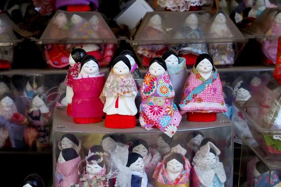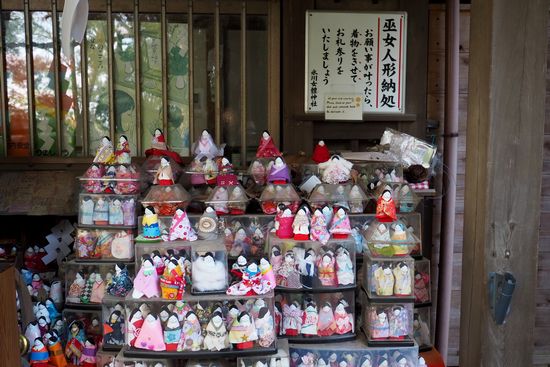 この神社での願い事が叶った人は、人形に着物を着せて奉納するそうです。女神の神社に