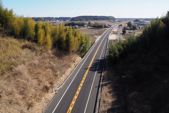 梅林の南北を結ぶ跨線橋から、下を通る銚子連絡道を見下ろす。高度差50mくらいあるでしょうか。