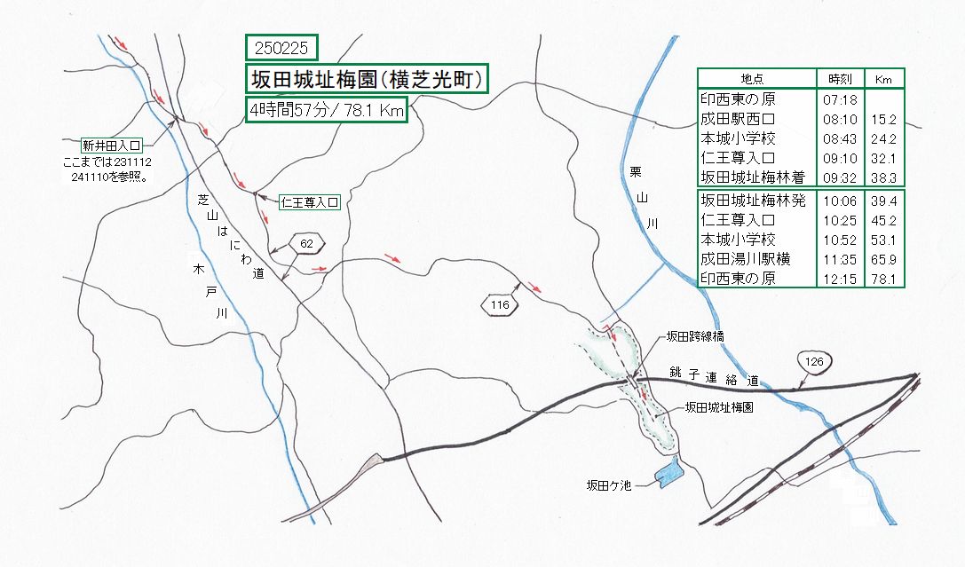 を経由しました。帰りは、成田ニュータウン外郭道経由で、成田湯川駅経由でしたが、距離も所要時間