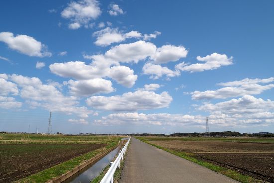 発作橋から、広い農地を一直線に貫く農道を行きます。ノスタルジックな雲が浮いていました。