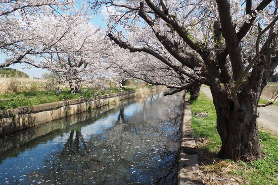 水面に桜の花びらが浮んでいます。水路が有ると、桜に趣を与えます。