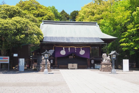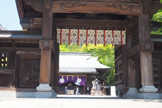 神門越しに拝殿を見ます。ご祭神は三柱ありまして、豊城入彦命(とよきいりひこ