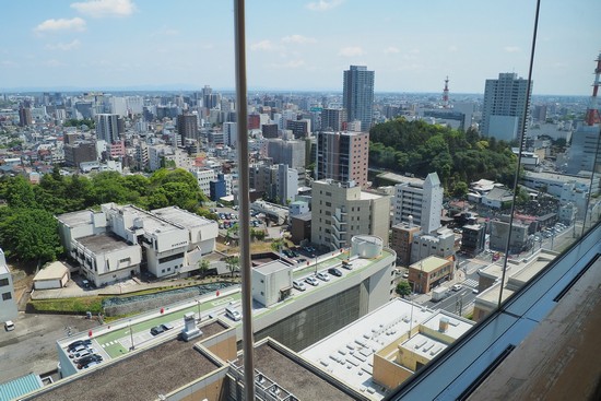 県庁15階からの景色。右側の緑の山が二荒山神社のある臼ケ峰です。
