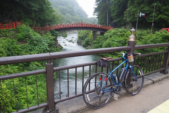 日光と言えば神橋。神橋を背景に撮影。霧雨が降っています。
