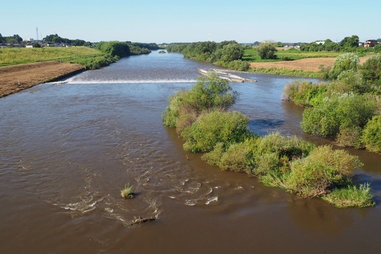 豊水橋の上からの鬼怒川。昨日の大雨で、茶色く濁り、増水しています。