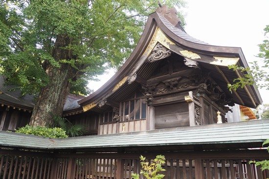 拝殿を回り込み、背後の本殿を撮影。太い木が写っていますが、樹齢800年の銀杏