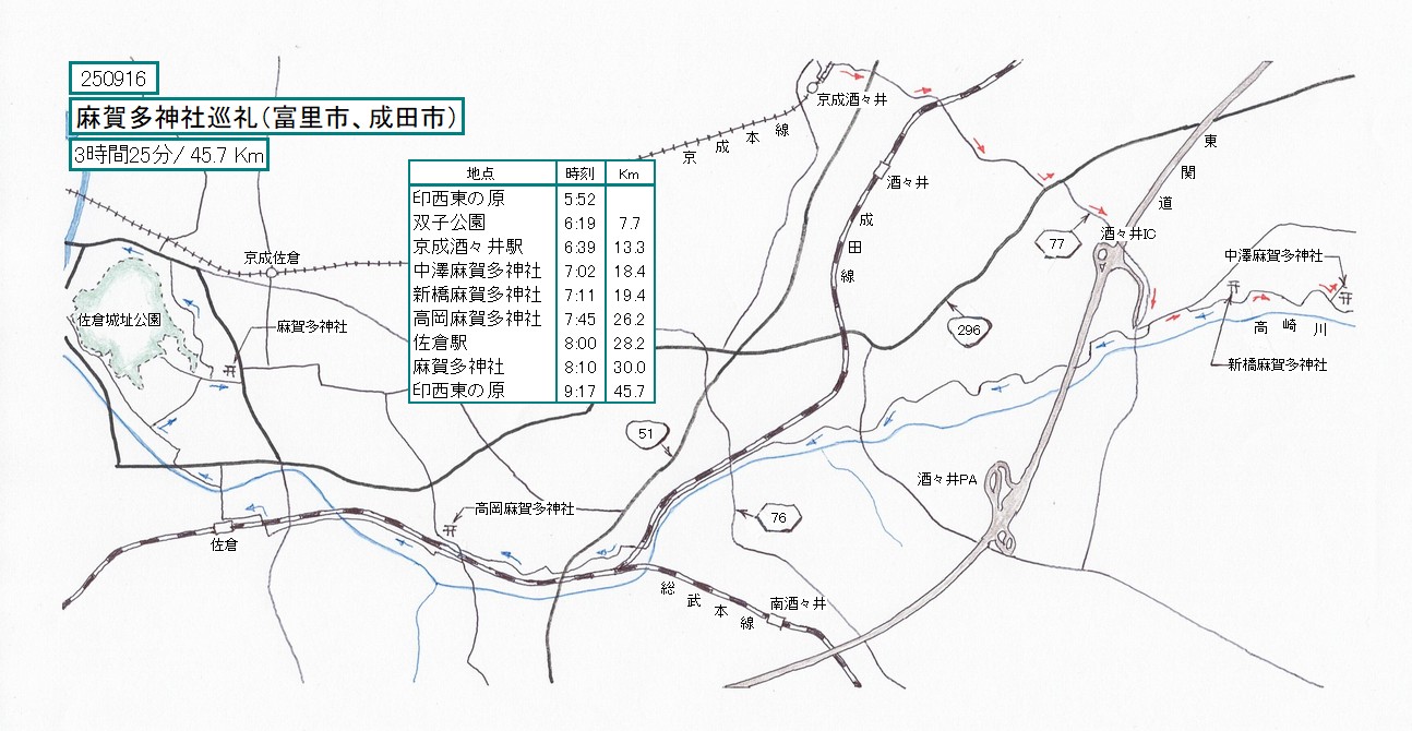 京成酒々井駅から坂を登って国道296号を越え、県道77号で高崎川の谷津に降りて