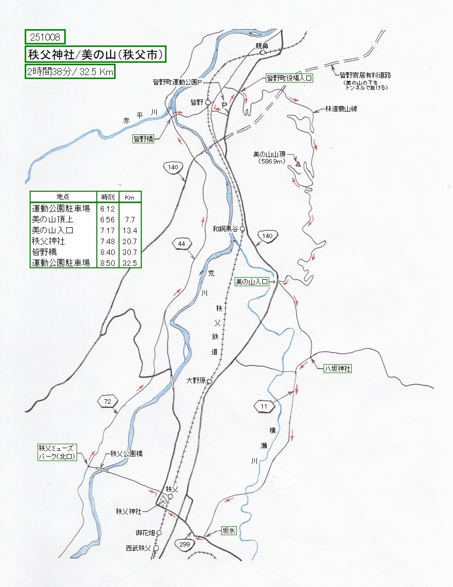 皆野町からすぐの美の山(蓑山)を越えて秩父神社に向かうルートを採りました。