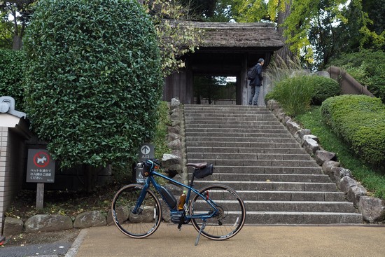 茅葺きの門のある戸定邸の前に着きました。階段の右側に駐輪場があります。