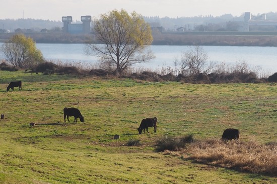長豊橋と常総大橋の間の茨城側の河川敷で良く見かける牛の放牧。