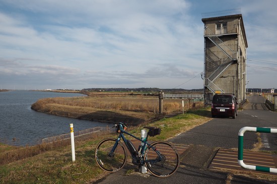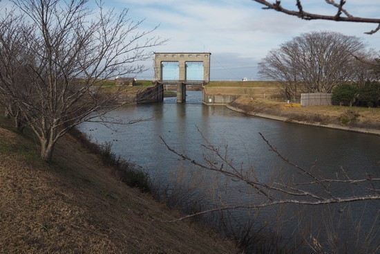 土手の上に出ました。水門と広々とした利根川の眺め。
