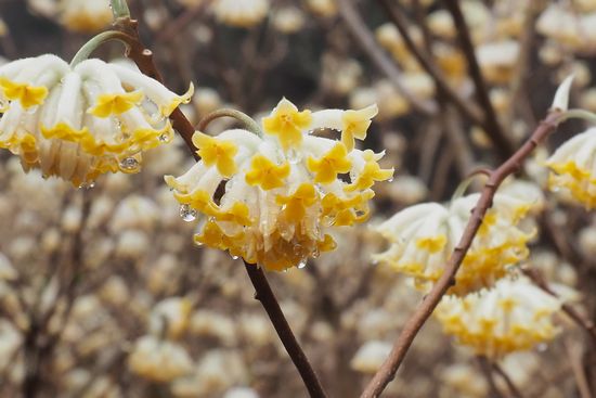 ミツマタの花のアップ。昨夜降った雨の雫が涙のようです。